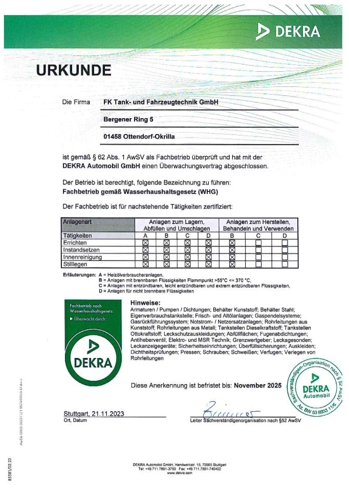 Wir werden aller 2 Jahre vom TÜV SÜD Industrie Service GmbH als Fachbetrieb nach § 19 I WHG überwacht und zertifiziert.